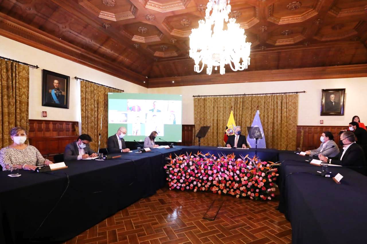 Quito, (30/03/2021).- La secretaria técnica de Planifica Ecuador, Sandra Argotty, participó hoy en la segunda reunión del Comité Técnico de Transparencia, que fue liderada por el presidente de la República, Lenín Moreno. Durante la cita -efectuada en el Palacio de Gobierno- se entregaron los resultados de la primera fase del proceso de transición, que fue trabajada bajo la metodología de pre empalme.