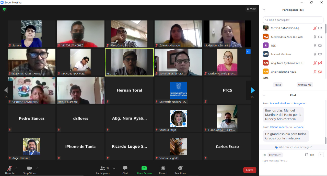 Guayaquil. Ecuador. Con la finalidad de formular aportes al Plan Nacional de Desarrollo (PND) 2021-2021 en el eje Social, la Coordinación Zonal 8 de la Secretaría Nacional de Planificación implementó tres Mesas Virtuales de Participación, en las que asistieron 61 representantes de organizaciones sociales e instituciones públicas.