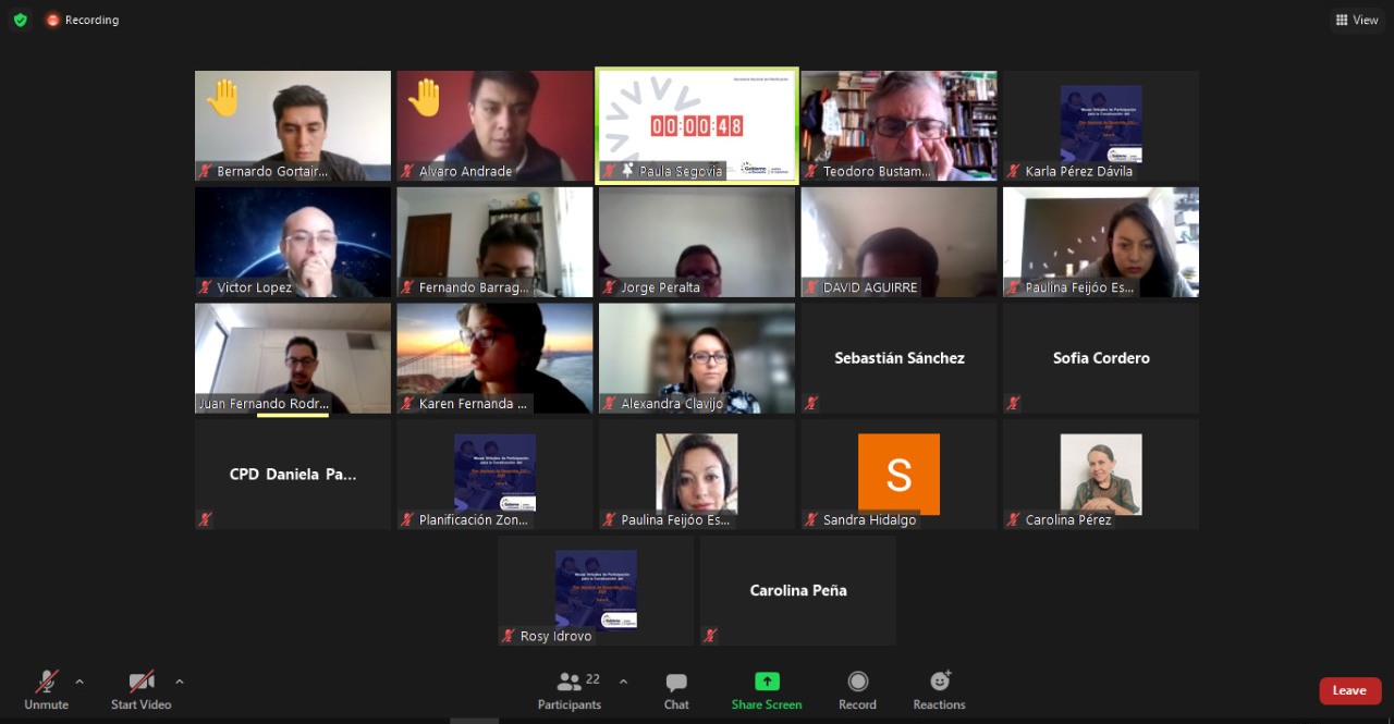 Quito. Ecuador. La Secretaría Nacional de Planificación, a través de la Coordinación Zonal 9, implementó dos Mesas Virtuales de Participación para la construcción del Plan Nacional de Desarrollo (PND) 2021-2025, enfocadas al eje social, con el fin de recopilar aportes ciudadanos en temáticas como salud, seguridad social, drogas, deporte, vivienda, discriminación y vulnerabilidad. Participaron 27 delegados de la academia, organizaciones de la sociedad civil, gobiernos autónomos descentralizados y organizaciones no gubernamentales.