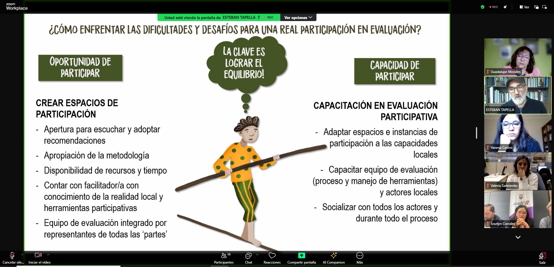 El experto Esteban Tapella explicó que la evaluación tiene que ver con determinar el mérito, el valor y el resignificado de una intervención. El experto argentino presentó casos exitosos de evaluación de intervenciones públicas que tuvieron en común la participación activa de actores y beneficiarios en el proceso evaluativo. Además, se refirió al Manual de Evaluación Participativa Siembra y Cosecha, que presenta metodologías para su implementación.