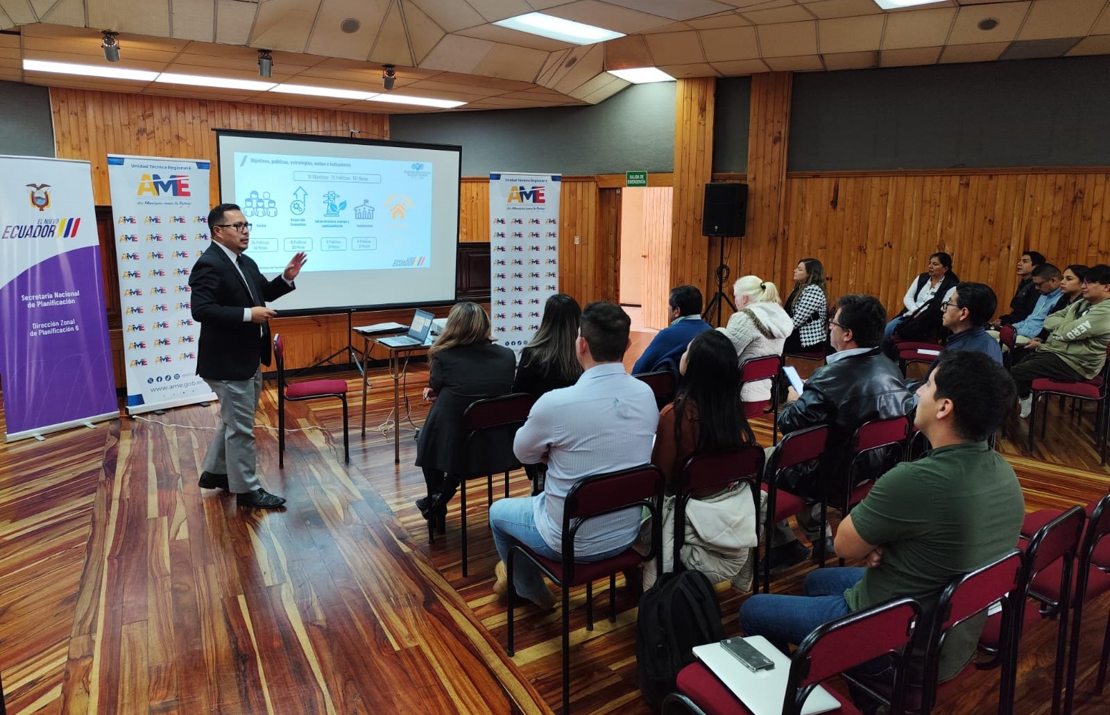 El equipo de planificación expuso el Plan de Desarrollo para el Nuevo Ecuador 2024-2025 y la Estrategia Territorial Nacional (ETN), sus objetivos, políticas, metas y directrices de los ejes: Social, Desarrollo Económico, Infraestructura, Energía y medioambiente, Institucional y Gestión de Riesgos.