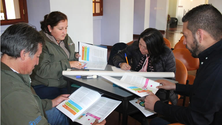 Mediante ejercicios prácticos los participantes del Ministerio de Inclusión Económica y Social (MIES), Ministerio de Agricultura y Ganadería (MAG) y Ministerio de Ambiente de Tungurahua plantearon una idea de proyecto y analizaron cuáles son los ejes, objetivos y políticas públicas a los cuales se podría vincular.