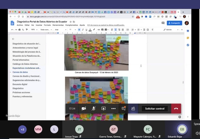 Quito, (09/04/2020).- Como parte del Plan de Acción de Gobierno Abierto Ecuador, específicamente del compromiso de “Rediseño y actualización del portal de datos abiertos”, se efectuó una reunión de trabajo con representantes de la Secretaría Técnica Planifica Ecuador, Presidencia de la República, Fundación de Ayuda por Internet (Fundapi) y la Cooperación Técnica Alemana, implementada por GIZ-Ecuador. El objetivo fue presentar el alcance y avances del compromiso, así como evaluar oportunidades de una cooperación.