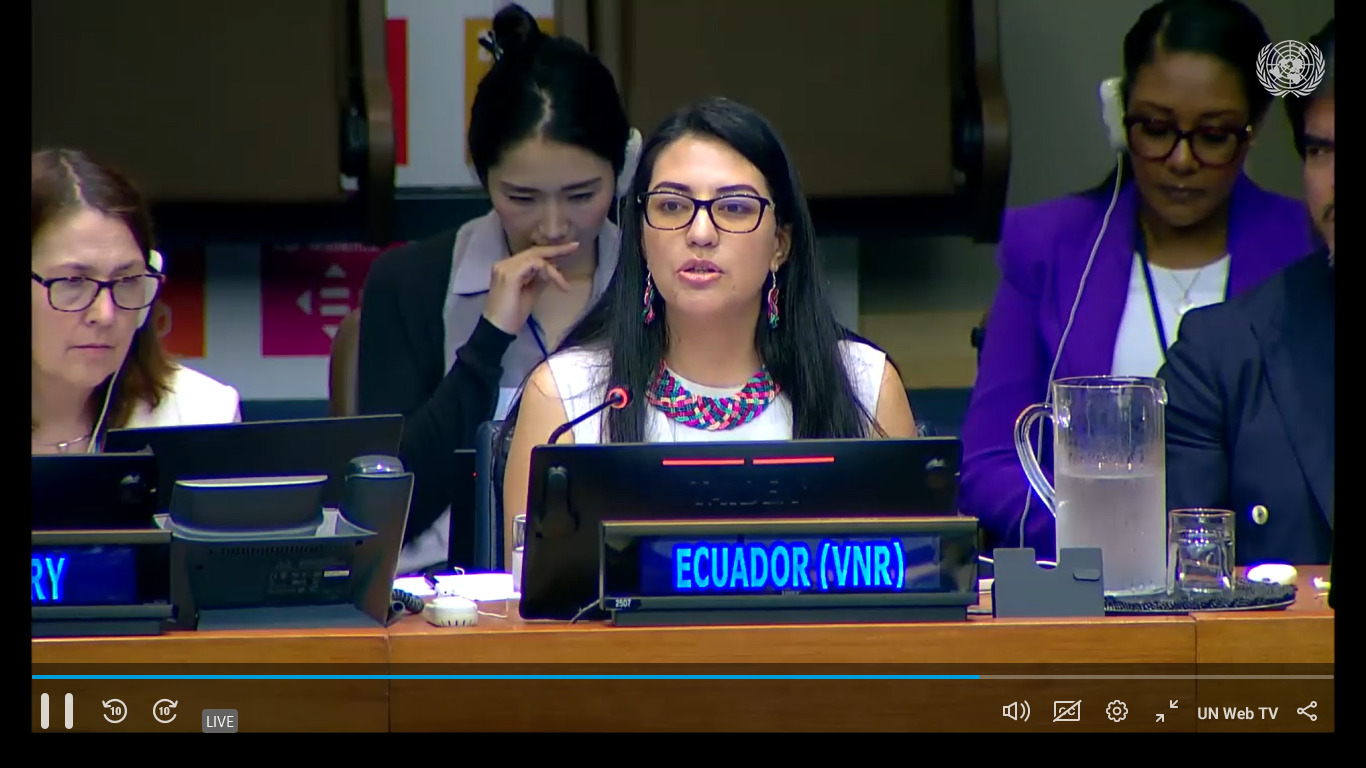 Quito (17/07/2024).- En la sede de Naciones Unidas, Nueva York,la secretaria nacional de Planificación, Sariha Moya, presentó el Examen Nacional Voluntario 2024 (ENV) de Ecuador, en el que se plasma el progreso realizado a escala nacional para la consecución de la Agenda 2030 y sus 17 Objetivos de Desarrollo Sostenible (ODS). La presentación se efectuó durante el Foro Político de Alto Nivel, bajo el lema de “Reforzar la Agenda 2030 para el Desarrollo Sostenible y erradicar la pobreza en tiempos de crisis múltiples: Aplicación eficaz de soluciones duraderas, resilientes e innovadoras”.