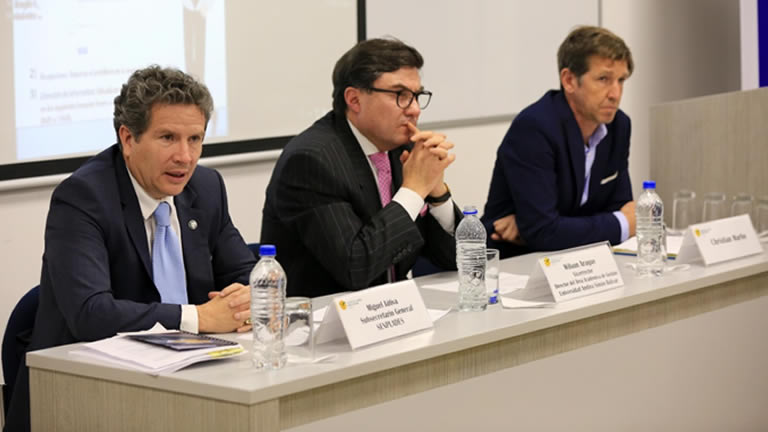 El subsecretario general de Senplades, Miguel Ángel Játiva, junto al vicerrector de la Universidad Andina, Wilson Araque, y el experto francés, Christian Marlin.